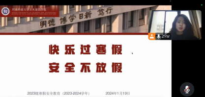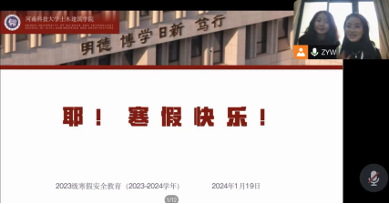 为做好2023-2024学年寒假学生安全教育和管理工作,让电子游艺 全体同学度过一个安全而有意义的假期,2024年1月19日下午,电子游艺 召开2023级寒假安全教育线上会议,23级全体班级委员、年级委员参加会议,2023级辅导员张红、张雨薇主持会议。