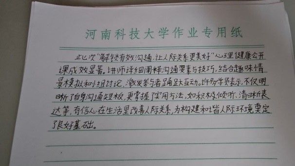 课程结束后,许多同学意犹未尽,纷纷拿起稿纸,迫不及待地将自己的所感所悟记录下来。笔尖在纸上跳跃,一行行工整的字迹,承载着同学们对有效沟通深刻理解与体会。