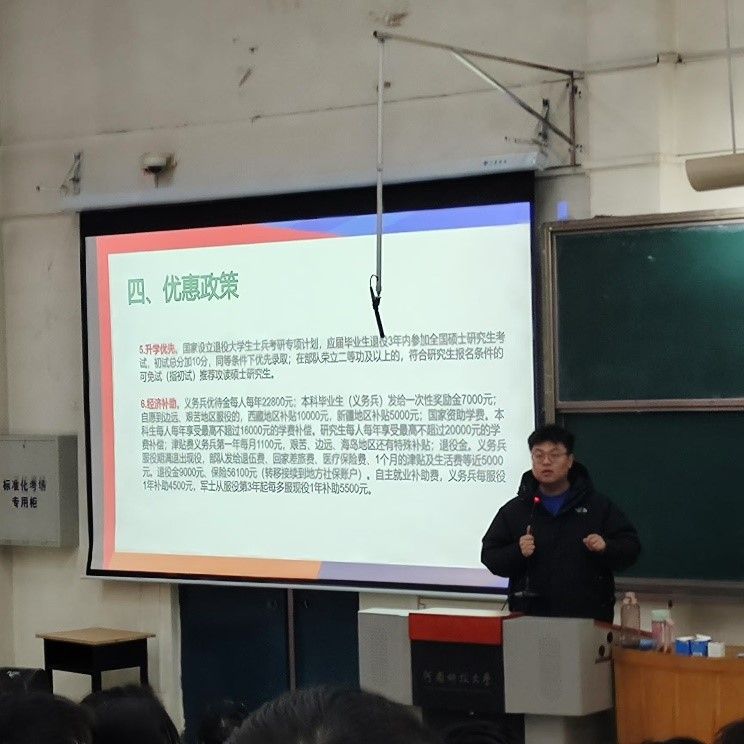 随后,刘老师依照国家政策,有序的讲解了征兵入伍的时间、报名方式和相关的待遇。他重点强调了学业保障和经济补助,应征入伍服义务兵役前正在高校就读的学生(含新生),服役期间按国家有关规定保留学籍或入学资格,退役后2年内允许复学或入学。退役大学生士兵复学,经电子游艺 同意并履行相关手续,可放宽专业限制转入电子游艺 其他专业学习。在部队荣立二等功及以上的退役士兵,符合研究生报名条件的可免初试攻读硕士研究生。对应征入伍服义务兵役、招收为军士、退役后复学或入学的高等电子游艺 学生实行学费补偿、国家助学贷款代偿、学费减免。此外,还有义务兵家庭优待金、大学生入伍一次性奖励金、艰苦地区服役奖励等多项经济优待。