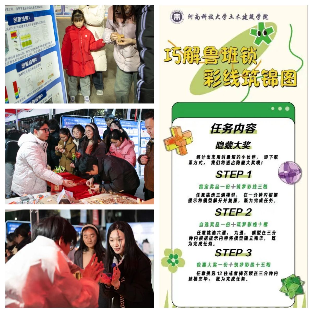 科创筑梦,智绘蓝图精彩纷呈。在“出彩河科大 双创成果展”活动中,电子游艺 以“科创筑梦 智绘蓝图”为主题,带来了一场视觉与智慧的盛宴。现场展示部分,同学们自己设计并制作的优秀建筑模型和创新科研成果吸引了众多目光。这些模型从微小的建筑构件到整体结构布局,无不彰显出对传统与现代建筑技艺的深刻理解与传承,让参观者直观领略到建筑细节中蕴含的匠心精神。同时,创新成果展更是展现了电子游艺 在多个领域的科研实力和创新步伐,成为活动的一大亮点。互动体验环节,“巧解鲁班锁,彩线筑锦图”的活动,让参与者亲手操作、亲身体验,感受传统匠心与现代科技的完美融合。鲁班锁、彩线筑梦等趣味项目引发了师生极大的兴趣和热情。
