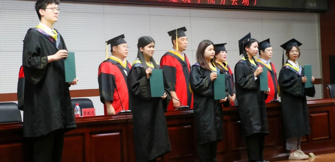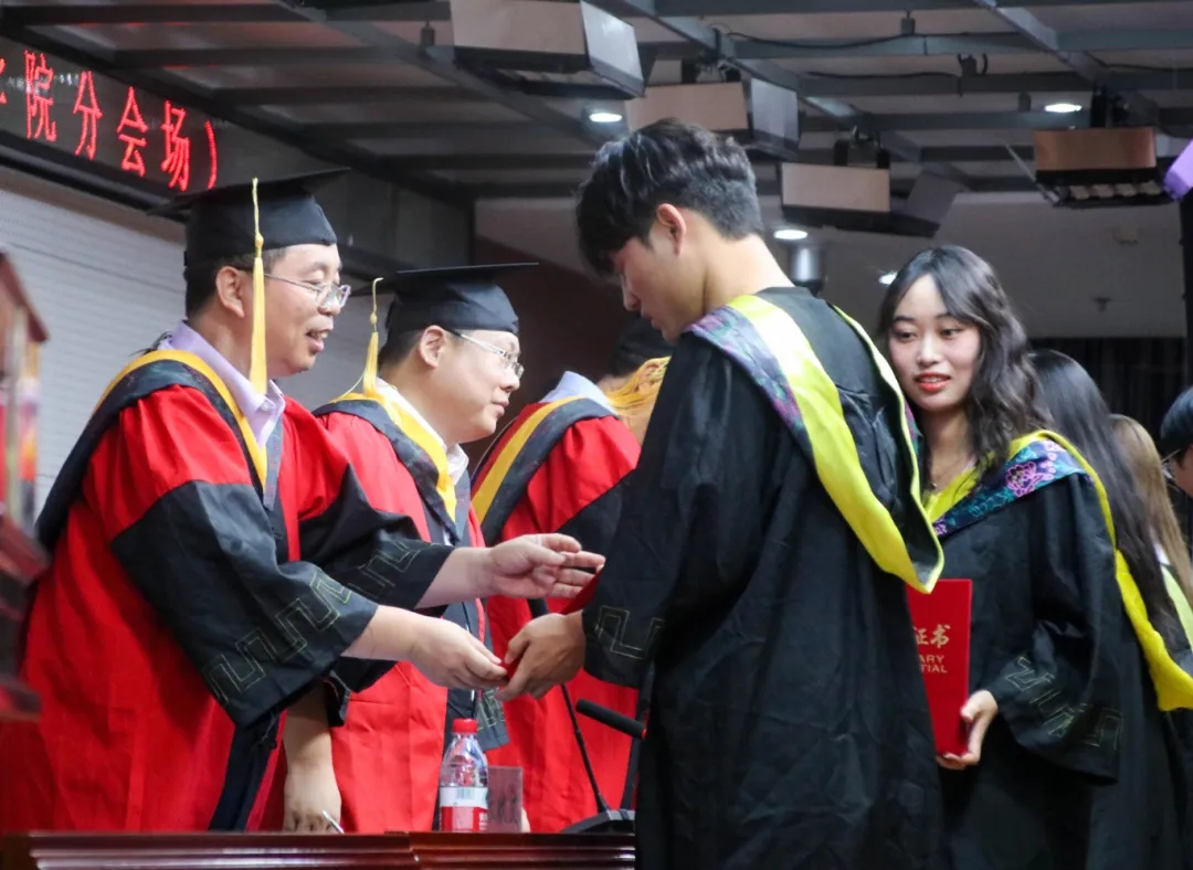 在激昂的乐曲中,院领导为电子游艺 2024届毕业生代表颁发毕业证书,为校级优秀毕业生代表颁发荣誉证书,为获得硕士和学士学位的毕业生授予学位,并拍照留念。